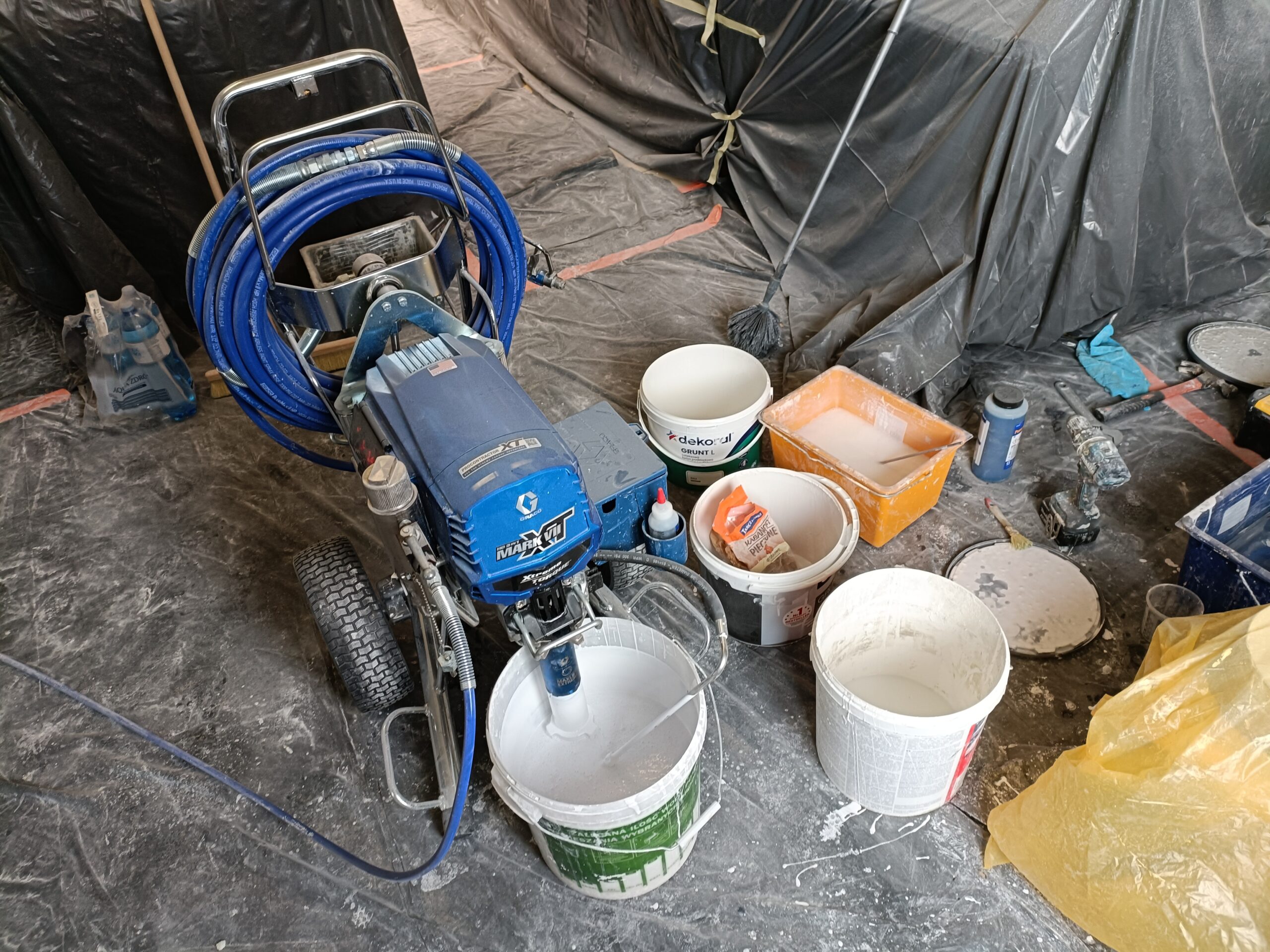Świadczymy kompleksowe usługi malarskie metodą natryskową, obejmujące: