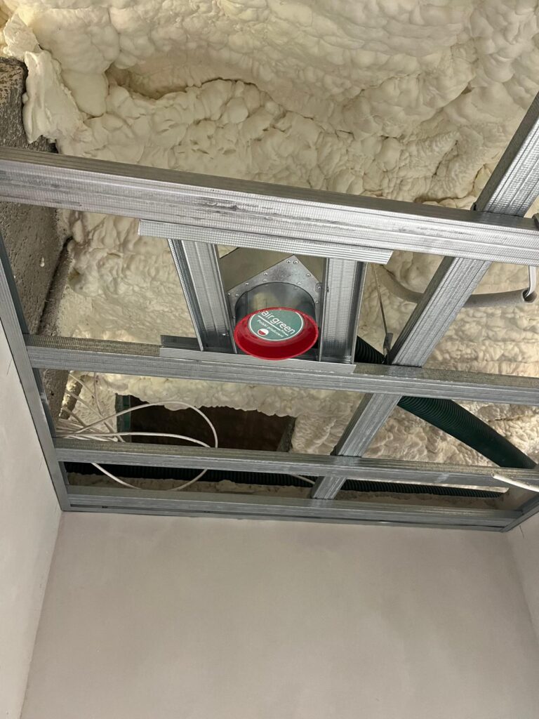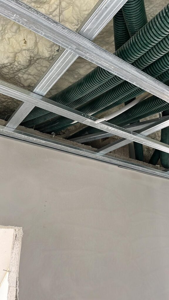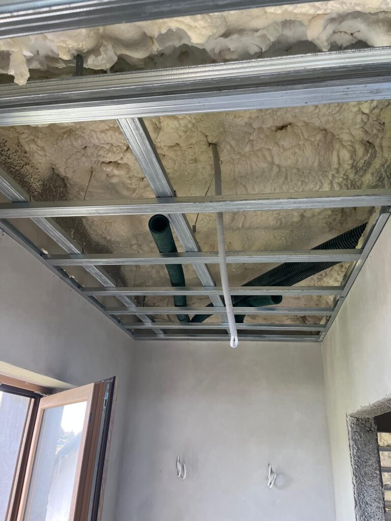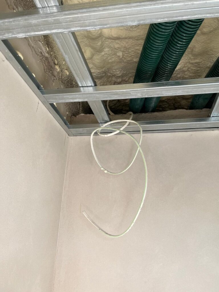 Sufit podwieszany to konstrukcja nośna wykonana z profili stalowych lub aluminiowych, zawieszona na kotwach i linkach stalowych pod oryginalnym stropem. Na konstrukcji montuje się płyty gipsowo-kartonowe lub specjalne panele sufitowe, tworząc równą, estetyczną powierzchnię.